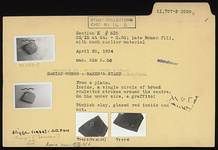 | Description: | Samian B plate fragment. Inside, a single circle of broad rouletted strokes around the center. On the underside, a graffito: <graphic> Pinkish clay, glazed red inside and out. | |