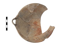 Description:   Nine joining fragments; one handle and ca one quarter of wall and rim missing. Burnt. Well tooled disc foot. Ribbon handles. Decoration in gloss bands on floor-one band at rim, dot at center, but rest of banding pattern unclear.