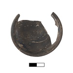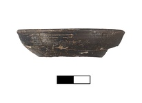 | Description: | Mended from six fragments. One third of rim and half of wall missing. Burnt. Shallow saucer with flat string-cut base. Pinkish buff to gray clay, shiny black to brown gloss. | |