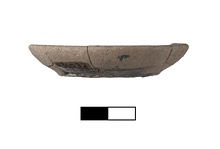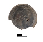 | Description: | Mended from seven fragments. Over one third of rim and wall missing. Irregular flat base with string marks. Slight concavity at base of wall. Tan clay; dull to metallic gray gloss, much missing on outside. | |