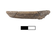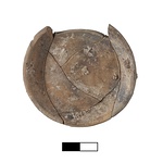 | Description: | Mended from six fragments. One quarter of rim missing. Burnt. Shallow saucer with flat, string-cut base. Thin gloss, mottled from brown to orange. | |