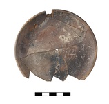 Very shallow saucer with flat, string-cut base and straight wall. Inner edge of rim has sharp edge.