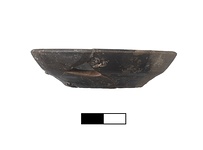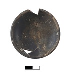 | Description: | Six fragments, with small fragment of wall and of rim missing. Flat, string cut base. Wall concave below, convex above. Shiny dark gray gloss, plenty missing on outside. Burnt. | |