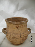 Description:   Mended from many pieces; complete save for one handle and chips. Heavy flaring ring foot; at the line of the handle attachments, a little above the middle of the body, a raised band. The rim flat-topped, with a groove around its outer edge. Around the body, two bands of glaze above and two below the raised band; on it, diagonal strokes. The inside probably glazed all over.