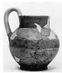 | Description: | Mended from many pieces; complete save for the handle, and a few fragments from the wall. Short straight neck; small flat base. Vertical handle from the rim to about the middle of the body. The neck was glazed inside and out; a broad band of black glaze around the point of greatest circumference, and another just above the foot. Dull buff clay; the glaze much peeled. | |