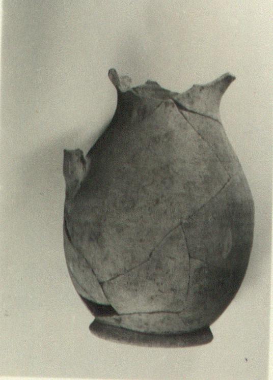 | Description: | Mended from many pieces; most of the rim and handle missing, and fragments from the body. Low ring foot; the mouth seems to have been round, and the handle double. Black glaze, nearly all peeled, apparently covered the whole outside, and the neck inside. Two narrow bands of red on the inside, just below the lip, and another on the outside, below the handle attachment. Dull buff clay. | |