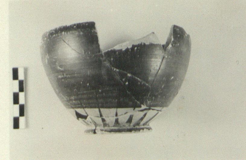 | Description: | Mended from many pieces; both handles missing, and fragments from wall and rim. High ring foot. Above it, a reserved band with rays. The handle space reserved. Glaze circles on the underside. Brownish-black glaze inside and out. Two red lines below the handles. Shape and decoration close to P 3612, but the fabric apparently Attic. Early Attic. | |