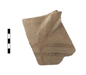 | Description: | Single fragment, broken on all sides, preserving small portion of body and handle of wheelmade vessel. Body rising steeply; horizontal handle, circular in section. Paint mostly worn, though decoration is clear enough, fired black wherever preserved. Two horizontal bands on belly below handle. Preserved handle attachment decorated with arch and bow that converge below attachment and extended over bands below. Fabric fine, close to pink 5YR 7/3-7/4. | |