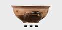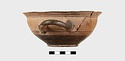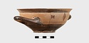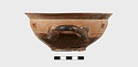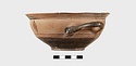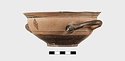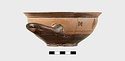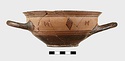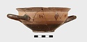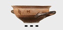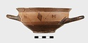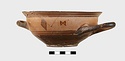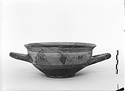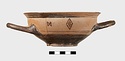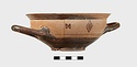 | Description: | Bowl with low ring base, convex side wall and outward flaring lip. Two horizontal loop handles. The lower body, to the points of attachment of the handles, is painted black; at the level of the points of attachment three narrow black bands. The handles are glazed black on the outside, unglazed inside. The upper body has, in black on each side, a latticed lozenge between two double-triangle hourglasses lying on their sides. On outer surface of lip, three narrow black bands; another on edge of lip. Interior, on inner surface of lip, four narrow black bands. Interior of side walls is glazed black; in center of floor, a round reserved panel is divided into eight segments by four lines crossing at the center; the space between this reserved circular panel and the black glazed side walls is filled by fourteen narrow circular bands, forming a series of concentric circles around the panel. Fine pinkish buff clay; the glaze dull brownish black. | |