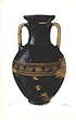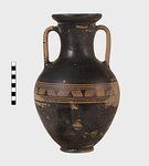 | Description: | Neck mended from many pieces; pot complete save small chips. Outside covered with glaze, save underside of base, handles and reserved band around center, which is nearly filled by the pattern in narrow stripes of glaze. Cross-striped ribbon handles. Unglazed inside save band 0.008m. wide within rim. Buff clay. Chipped mottled glaze, fairly solid over one large part. | |