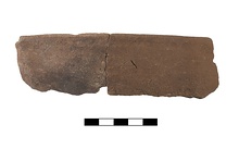 | Description: | Two joining fragments preserve less than a quarter of rim and upper wall. Continuously curving wall, in contrast to later lopadia, which are constricted below the rim. Plain rim. Prominent flange inside to receive lid. Gritty cooking fabric, micaceous, with flecks of golden mica, small black inclusions, and minute white shell-like inclusions. | |