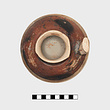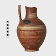 | Description: | Rim missing and top of handle. The body and neck are covered with black glaze, except for reserved bands, the central one decorated with a zigzag in dilute glaze. Bars on the handle. Early Geometric. | |
