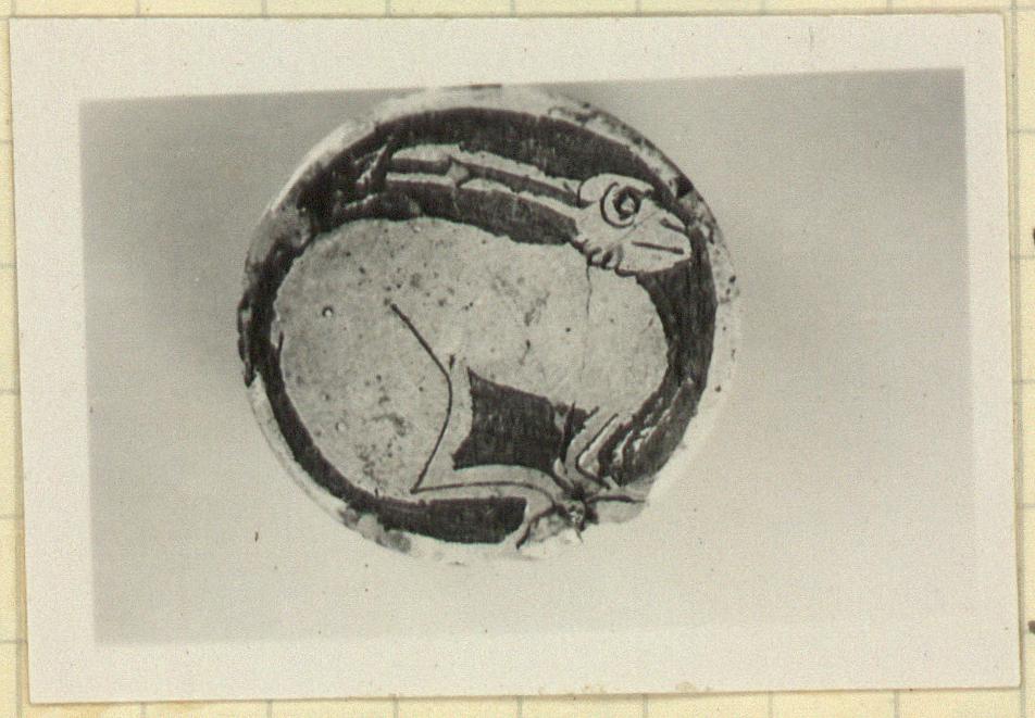 Description:   Small shallow dish set on a stand; stem broken off. The design, in elaborate incised style, shows a seated hare facing right. The background scraped away: Β 2