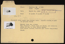 | Description: | Mended from two pieces. For "figure", white laid on thick, and details drawn on top in thin brown glaze. Good glaze inside; outside not fired completely black. ADDENDA Bell or Calyx krater(?), seated figure left in white garment and ornamented cloak. White laid on thick and details drawn on top in thin brown glaze. | |