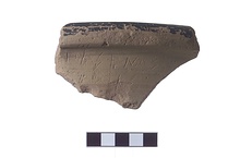 | Description: | From the rim of a large krater. Rather small rolled rim. Black glaze on the inside, on the rim, and probably for a band below the inscription on the outside. Scratched in the dry clay: <graphic> | |