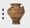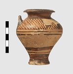 | Description: | Complete but for two missing handles (out of three) and chipped along base. Surface spalling on lower belly. Glaze slightly chipped on rim. Paint cracking at bases of handles and at rim where paint is thicker. Low neck with projecting downturned rim, piriform body, slightly splaying ring foot. Horizontal loop handle(s) at shoulder. Thick brown paint: on rim and on interior of neck. Diluted orange to brown paint on exterior of neck and lower body. On shoulder, well preserved net pattern above three diluted lines fired orange to dark brown; on lower body, three sets of horizontal framing bands, varying in width. Underside of base, reserved. Fine, pinkish-yellow fabric. Mycenaean LHIIIA1. Cf. P. Mountjoy, Guide to Identification (1986), p. 56, FS 44, no. 3, fig. 62. Sample of fill from inside the vessel: AS 2224. | |