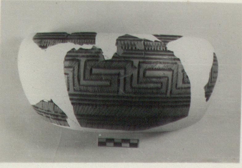 | Description: | The nine fragments, which mended up to five, have been restored with plaster to make something less than half the circumference of the pyxis. None of the bottom is preserved, but a small part of the rim, and considerable portions of the sides. Unglazed inside. The rim, slightly concave on top to hold the lid, has a band of red glaze around the inner edge, and of black glaze around the outer edge. The wall is separated into four horizontal zones, by means of four groups of three bands of glaze. The zones, from top to bottom: zigzag, hatched maeander, diagonals, large zigzags(?). Clay pinkish buff; glaze, black to light brown. The clay micaceous, with bits; light buff slip. | |