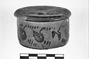 Description:   The top has no knob, but a heavy overhanging rim, and is unevenly flat. Straight, very thin sides. In black: on top, in concentric bands from center out: a circle, row of dots, circle, dots, large irregular blobs; the upper side of the rim. On walls, a row of crude water birds, to right, with dots or short bars above and below, between them; a narrow band around the bottom.