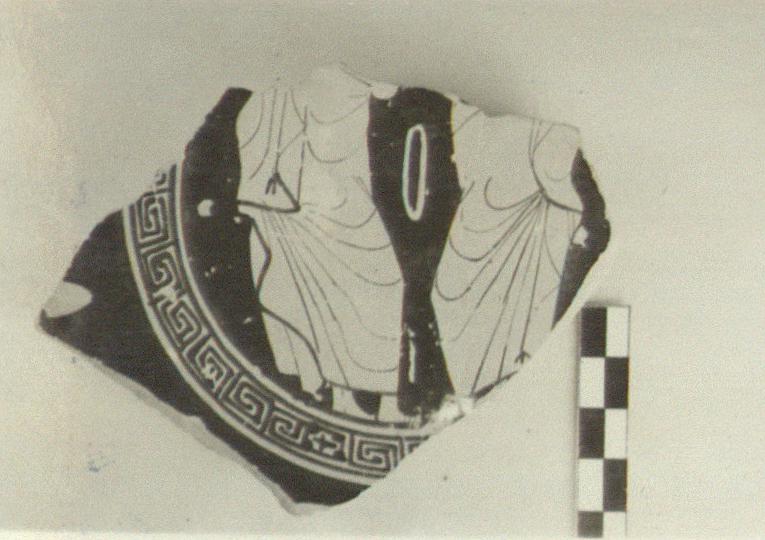 | Description: | A bit of the center of the bottom only preserved. Inside, within a border of maeander and cross squares, two cloaked figures facing each other. Between them hangs a fillet. Both missing from shoulders; and the feet of the right-hand figure. On the outside is preserved only the feet and lower drapery of a figure right, with a staff; in front of him the foot of a second figure, facing; behind him, a bit of a palmette. Some inner markings in relief; fair glaze. | |