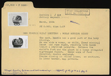 | Description: | The neck, handle and a good part of the body missing. On one side a woman, or child, (head missing) leans and runs right, reaching both hands toward a stylized palmette. Between the child's foot and the plant is a large elongated egg-shaped object. Underside of foot reserved; inside unglazed. Coarse drawing in relief lines; no contours. In lower border, egg pattern. | |