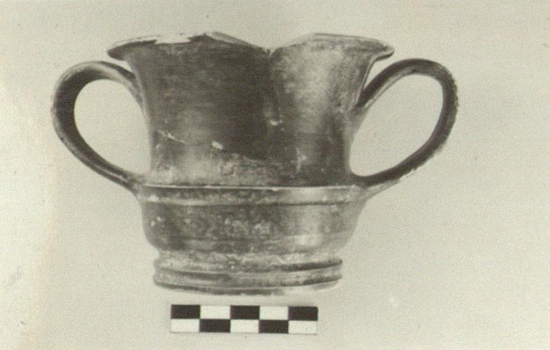 | Description: | A few rim fragments missing. Normal kantharos-shaped upper body; hint of ribbing on lower body. Simple strap handles, carelessly attached; low, wide foot. Bottom of foot ring and underside of foot reserved, but with splotches of glaze. Black glaze inside and out, partly fired red. Fine slightly granular clay, dull pink with occasional gray. Glaze decidely greenish and red. | |