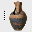 Description:   Part of the neck and shoulder missing. Slightly flaring base; ribbon handle. The body is glazed black, decorated with a reserved zone running around it under the handle, with a dilute zigzag bordered by lines. Slightly flaring base.