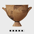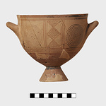 Description:   Portions of one side and the body missing, and one handle. Glazed inside and outside on the lower part and conical foot. Pendent loose lines from the horizontal handles. On the upper part, compass-drawn circles beside crosshatched diamonds in vertical panels set off by three lines. Bands above and below.