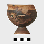 | Description: | Most of one side missing. Conical foot. Glazed on inside and out. On the rim, narrow zone of zigzags in dilute glaze. Reserved dot inside. | |