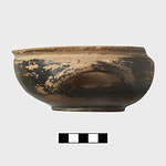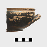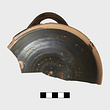 | Description: | Half of an open bowl, with a ring base and horizontal handle. Slightly out-turned rim. Glazed black inside and out, except for reserved lines around the rim. | |