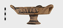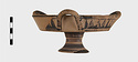 | Description: | Half a flat dish with deep upturned rim and high horizontal handle.Restored in plaster. High splaying foot. Outside, on the rim, tooth pattern; beneath and on the foot glazed bands of varying width; inside, a cross with dots at the edge of the circle between the arms, and glazed bands of varying width. Solid glaze inside the rim. | |