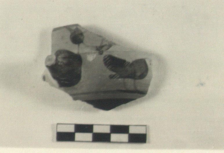| Description: | Fragment from the upper part of a kylix including one root of one handle. The lip is slightly inset. On the outside of the lip a band of floral ornament. On the upper part of the side wall proper a zone of figures of which one bird remains, standing to right. Purple on shoulder of bird; incision for interior details. Black glaze inside save for a reserved line around the lip. Fine buff clay. | |