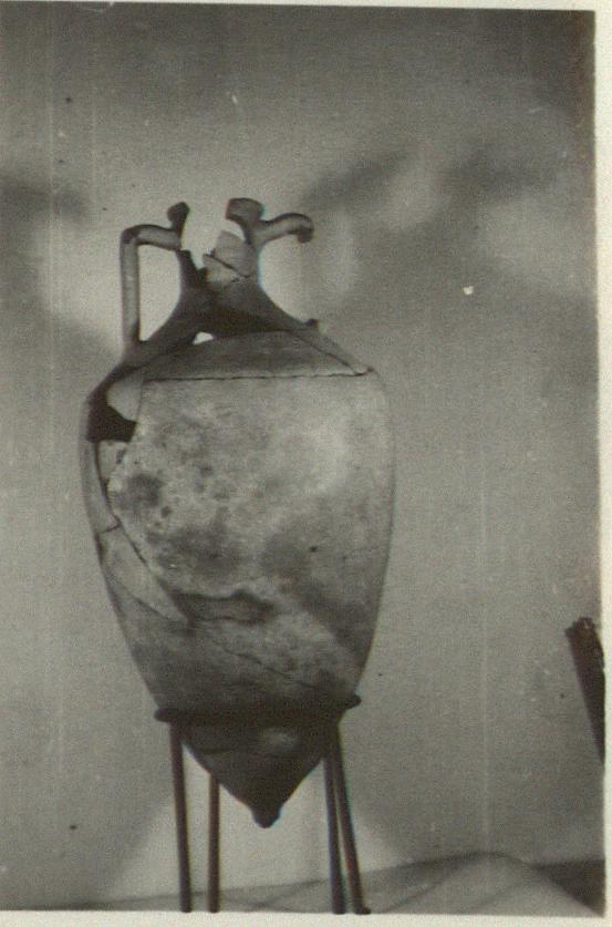 | Description: | Part of one handle and fragments from the side are missing. Fairly plump body with well defined shoulder; small tip twice drawn in; low neck; thickened lip; double handles. Coarse red clay fired pale yellow outside. No stamps. Unglazed. ADDENDA A similar but less complete specimen has been preserved uncatalogued [catalogued lates as P 25737]. | |