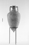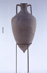 | Description: | Part of one handle and fragments from the side are missing. Fairly plump body with well defined shoulder; small tip twice drawn in; low neck; thickened lip; double handles. Coarse red clay fired pale yellow outside. No stamps. Unglazed. ADDENDA A similar but less complete specimen has been preserved uncatalogued [catalogued lates as P 25737]. | |