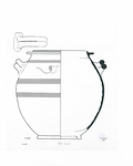 | Description: | Broken into many fragments of which not a few are missing; restored in plaster. Low base ring. Barrel-shaped body. Around the lip a broad flange to receive the lid. Two double, horizontal handles. Gritty buff clay, decorated with three bands of brown glaze around the upper wall and another on the lid flange. Between the two upper bands a garland of ivy in brown glaze. Cf. P 3567. | |