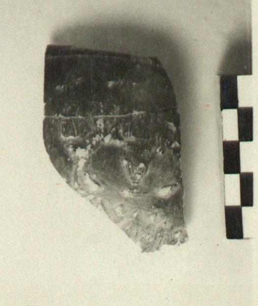 | Description: | Wall fragment depicts two rampant goats before krater above which is a mask in the center. Birds above and a second mask to the left. Firm black glaze. | |