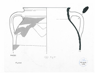 | Description: | Only the upper part with the two handles preserved. Plump body; low, vertical neck with thickened lip; strap handles. Decorated on the outside with rude stripes of red paint. Gritty, flaky clay, buff-yellow in color. | |