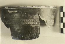 Description:   Rim fragment with part of upper wall. The side wall is filled with tall, sharp-pointed petals of the nymphaea coerulea alternating with tendrils. On one of the tendrils sits a bird. A simplified guilloche and a line of running spirals form the upper zone.