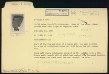| Description: | Part of the rim and side of a large pot, the wall pierced by a row of elliptical holes ca. 0.10m. below the out-turned rim. Dull buff clay, originally covered on the outside with a thin black wash, nearly all of which has peeled off. Unglazed inside, save where the black wash has run through the holes. Cf. P 11204, P 15785, P 23085, P 22861. | |