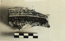 | Description: | From a deep plate or shallow bowl with flaring moulded rim. Around interior, inside rim, a grooved line. Rim has flat upper surface between raised bands, and decorated with wave pattern in relief. In relief on the outer face of the rim, above, a line of dots, below, egg and dart pattern as decoration. Grayish clay, covered with soapy black glaze. ADDENDA Second piece from same pot; from pottery storage in 1940. | |