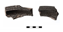 | Description: | From a deep plate or shallow bowl with flaring moulded rim. Around interior, inside rim, a grooved line. Rim has flat upper surface between raised bands, and decorated with wave pattern in relief. In relief on the outer face of the rim, above, a line of dots, below, egg and dart pattern as decoration. Grayish clay, covered with soapy black glaze. ADDENDA Second piece from same pot; from pottery storage in 1940. | |