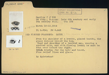 | Description: | From the shoulder of a krater, glazed inside, the glaze thinner toward the top. Head and shoulder of a bearded man, wearing a spotted skin, and with flowing locks; he must be bent over toward the right. Brush drawing for the hair and beard. Fine relief lines. Fine glaze. | |