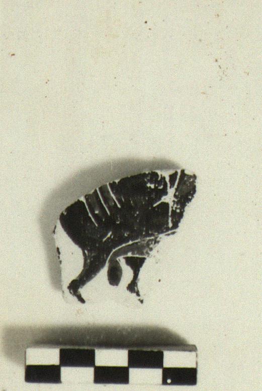 | Description: | From the side wall of a large closed pot, unglazed inside and decorated on outside with animal friezes, of which is preserved back part of body and legs of a bull walking to the right.. Black glaze with red utonebes. Slightly micaceous buff clay. | |