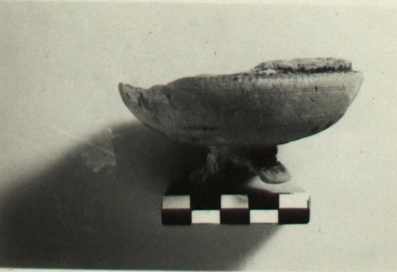 | Description: | Small bowl with conical foot, moulded on outside. One small non-joining fragment. Partly restored in plaster. Body shallow convex with narrow turned-in shoulder, on which rests a lower vertical lip. Around center of floor, two grooves with rouletted line between them; in center, traces of a stamp. Shoulder rouletted on exterior. Soft, gray clay with badly flaked black glaze. Samian B Ware. | |