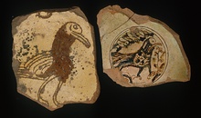 | Description: | Ring foot, most of the central medallion and the start of the curving sides of a bowl. In the medallion, a small bird, with long beak and claws, and extensive tail, facing right; small branch in front; wavy lines (more tail?) above bird. Pattern scratched through white slip. Greenish iridescent glaze. Orange clay; light green glaze outside. | |