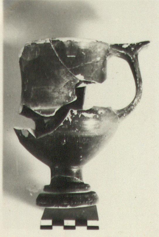 | Description: | One of the flat-topped, vertical handles missing, also fragments of body. Slightly out-turned rim. Black glaze, fired red at bottom within. Reserved as P 4410. Restored in plaster. ADDENDA P 4410: Reserved band on and under base. | |