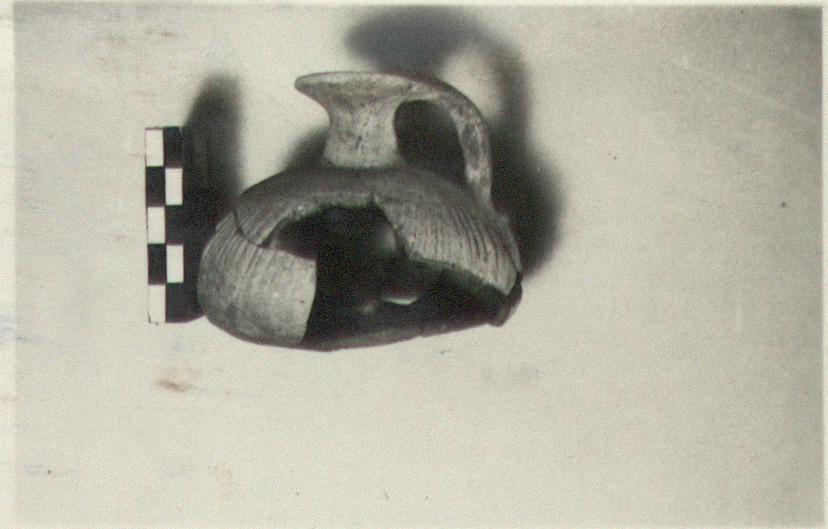 Small, squat, roundish jug with narrow neck, round mouth and single vertical handle. Flat bottom. On body incised diagonal lines.