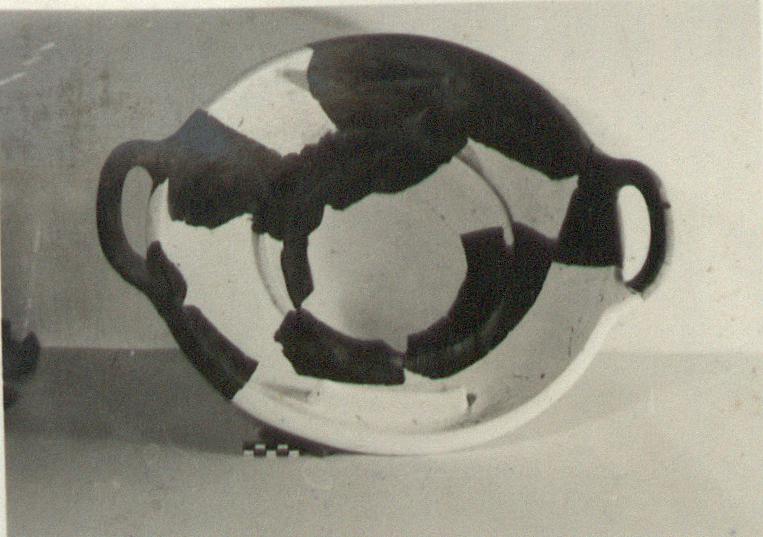 | Description: | The bottom entirely missing, also about half the upper part. Two non-joining groups. A central bowl, perhaps with rounded bottom and a very broad sloping rim on one side of which is a large lug. Two horizontal handles rise above the rim. Gritty reddish clay. Thin blackish wash on interior. Buff slip on exterior. Restored in plaster. ADDENDA Hard gritty clay. 2.5YR 5/6 at break; yellow surface (ca. 7.5YR 6/4). Micaceous. Many small white,shiny gray [inclusions]. | |