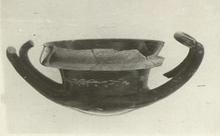 | Description: | Foot, part of handles and part of outer edge of rim broken away. Horizontal handles. Breaks show how heavy rim was made: near the lip the body of the vase divides in two parts, one continuing to form the lip, the other projecting horizontally for ca. 0.015m. An added band of clay, extending from the lip to the edge of this projection, forms the rim. Hard black glaze mottled with red, and showing red where it has been chipped away. Inside, hatched bands; outside, wreath, in heavy buff paint. Attic clay. | |