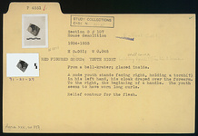 | Description: | From a bell krater; glazed inside. A nude youth stands facing right, holding a torch(?) in his left hand, his cloak draped over the forearm. To the right, the beginning of a handle. The youth seems to have worn long curls. Relief contour for the flesh. | |