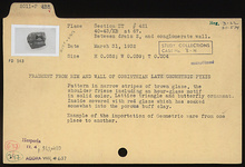 | Description: | Fragment from rim and wall. Pattern in narrow stripes of brown glaze, the shoulder frieze including an hourglass motif in solid color. Lattice triangle and butterfly ornament. Inside covered with red glaze which has soaked somewhat into the porous buff clay. Corinthian Late Geometric Pyxis. Example of the importation of Geometric ware from one place to another. | |